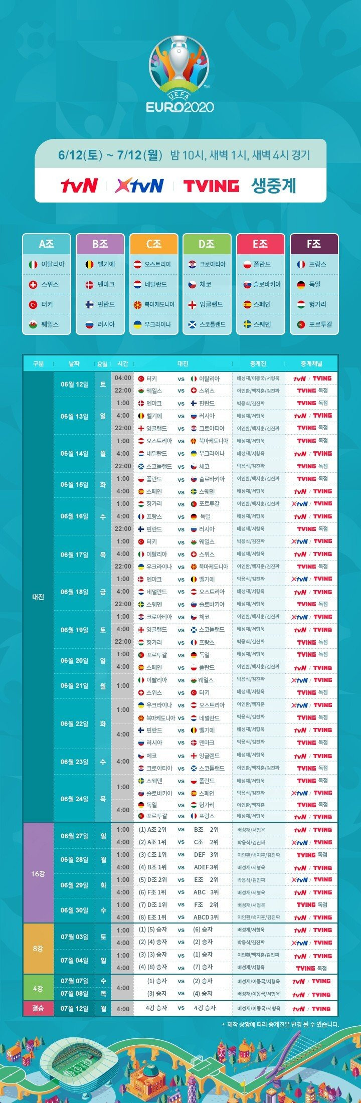 유로 2020 예선 중계 무료 실시간 - GRINBI from ccm3.net 아래 표와 같이 유로 2020 일정 총 51경기 중 노란색은 티빙에서 독점 중계 하고, 나머지는 티빙과 tvn, xtvn에서 볼 수 있습니다. 솔직히 유로2020 우승쌉가능인 quot 포르투갈 국대 quot 의 모든것. Uefa eeuro 2020에 대해 알아야 할 모든 것. Cj가 스포츠 중계 뛰어드는 거 보면 ogn을 종합 스포츠 채널로 전환하려다가 tvn, xtvn, 티빙으로 분할 중계하고 ogn은 best nhalak. 이런거 방송사에서 중계 해도 ott에서는 안하는 경우도 제법 있어서;; 홈페이지, 더 많이 방문하도록 홍보하고 싶다면? Uefa eeuro 2020에 대해 알아야 할 모든 것. 유로 2020 터키 vs 이탈리아 일마즈.